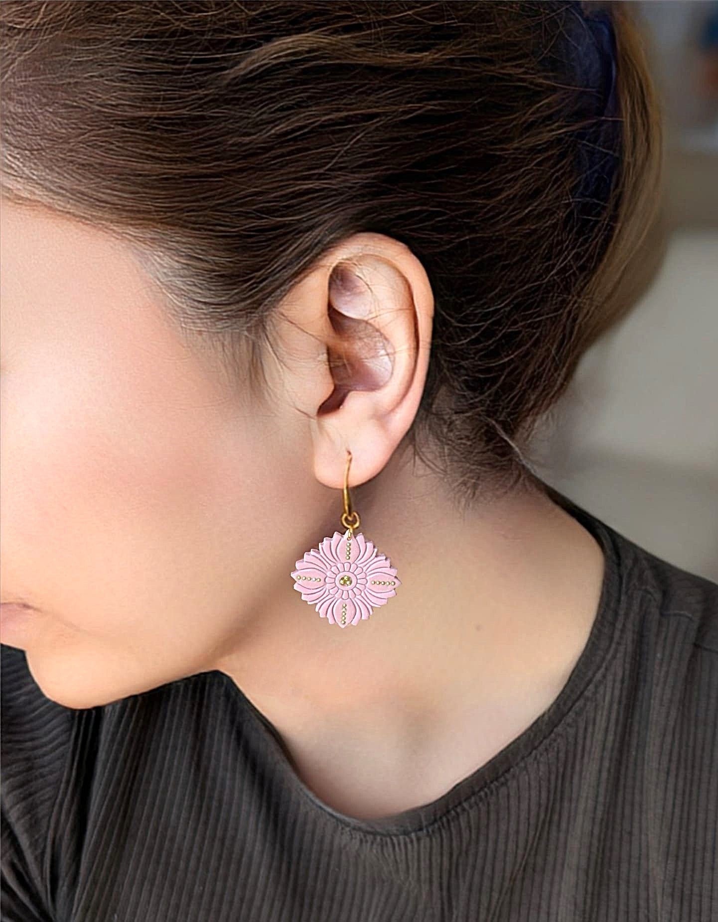 - Opt for gold-toned accessories to complement the earrings' finish.