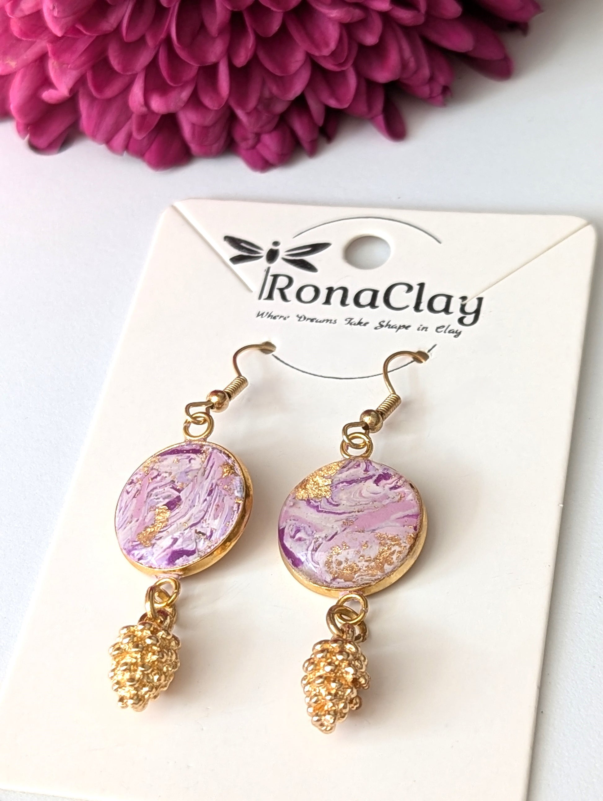 Marbled purple design with gold feather and Pinecone charms -Handmade Polymer Clay Earrings